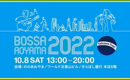 LIVE INFORMATION 2022年10月8日(土)BOSSA AOYAMA 2002 【BOSSA AOYAMA 2022】 ボサノヴァのフリーライブイベント、BOSSA AOYAMAが今年も開催決定! Saigenjiの出演は 16:00〜ワールド北青山ビル です https://www.bossa-aoyama.jp/ tagPlaceholderカテゴリ: