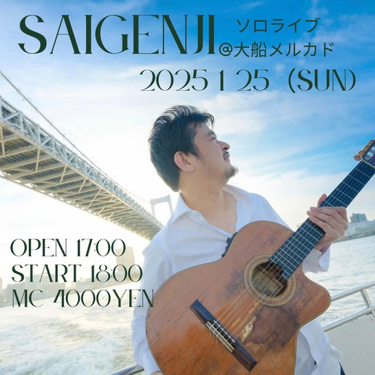 LIVE INFORMATION 2026年1月25日(日)大船 メルカド Saigenji ソロライブ OPEN 17:00 / START 18:00 Music Charge ¥4,000 メルカド 神奈川県鎌倉市大船1-18-12 ご予約はこちらから https://mercado-ofuna.studio.site/ tagPlaceholderカテゴリ: コメントをお書きください コメント: 0